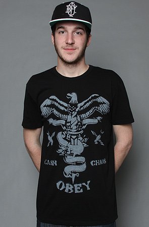 Obey The Cash for Chaos Stencil Antique Tee,T-shirts for Men: Model is wearing a size MEDIUM The Cash for Chaos Stencil Antique Tee is made from 100% cotton and features a screen print eagle motif with text reading "Cash Chaos." By Obey