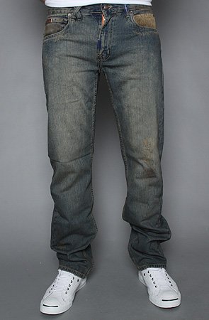 LRG The High Plains Drifter True Straight Fit Jean in Medium Indigo,Denim for Men: Model is wearing a size 32" The High Plains Drifter True Straight Fit Jean is made from 100% cotton and they feature six total pockets (including a discolored left change pocket and flap snap button back pockets) an LRG metal plaque at right pocket a zipper fly with tag and one button closure an LRG patch on the back beltline embroidery on the back pockets and a worn look thoughout. By LRG