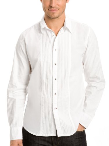 Look good down to the last detail. Long sleeve button-down shirt has woven stripe placket and sleeves. Buttons have embroidered GUESS letters. 100% Cotton Machine wash cold Men > Tops > Button Down Shirts.